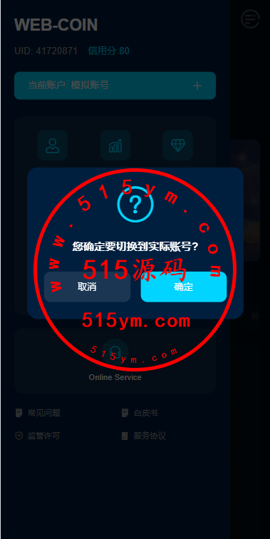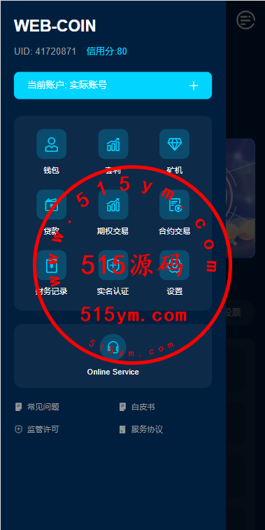 支持模拟账号,期权交易,合约交易,质押,信用分,贷款,实名认证等功能