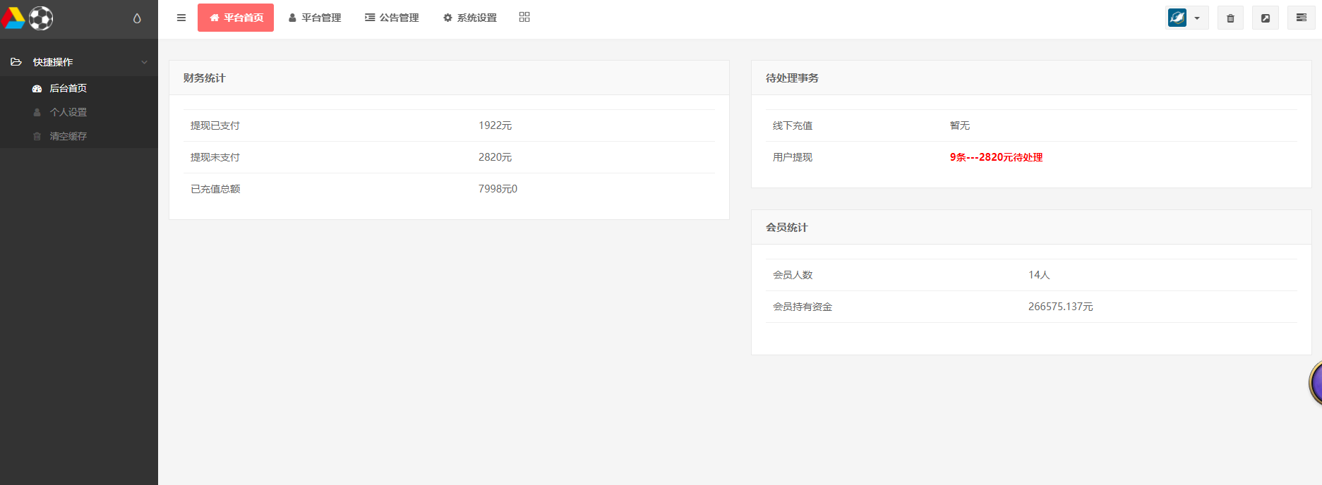 12.后台增加平台数据统计,会员量,充值量,提现量,会员持有资金统计等,,