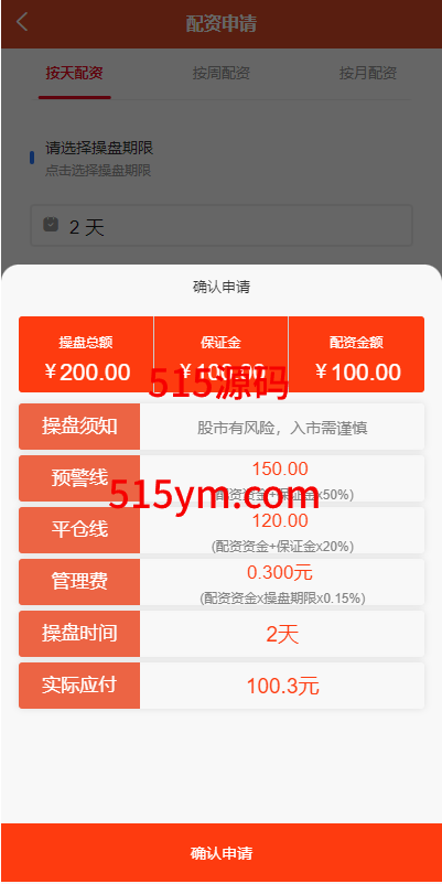 系统设有预警线自动平仓线,可按天配资,按周配资,按月配资,到期之后自动延期扣除手续费即可