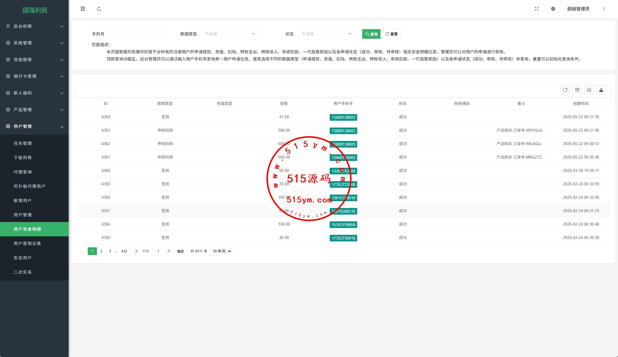 支持签到,内部转账,三级分销,排名等功能