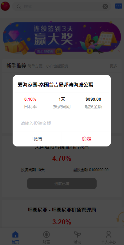 用户注册成功->认证邮箱->充值->购买项目->生成订单->根据设定的收益每日返利->末天返还本金->提现时先添加钱包->发起提现->后台审核通过->提现到账