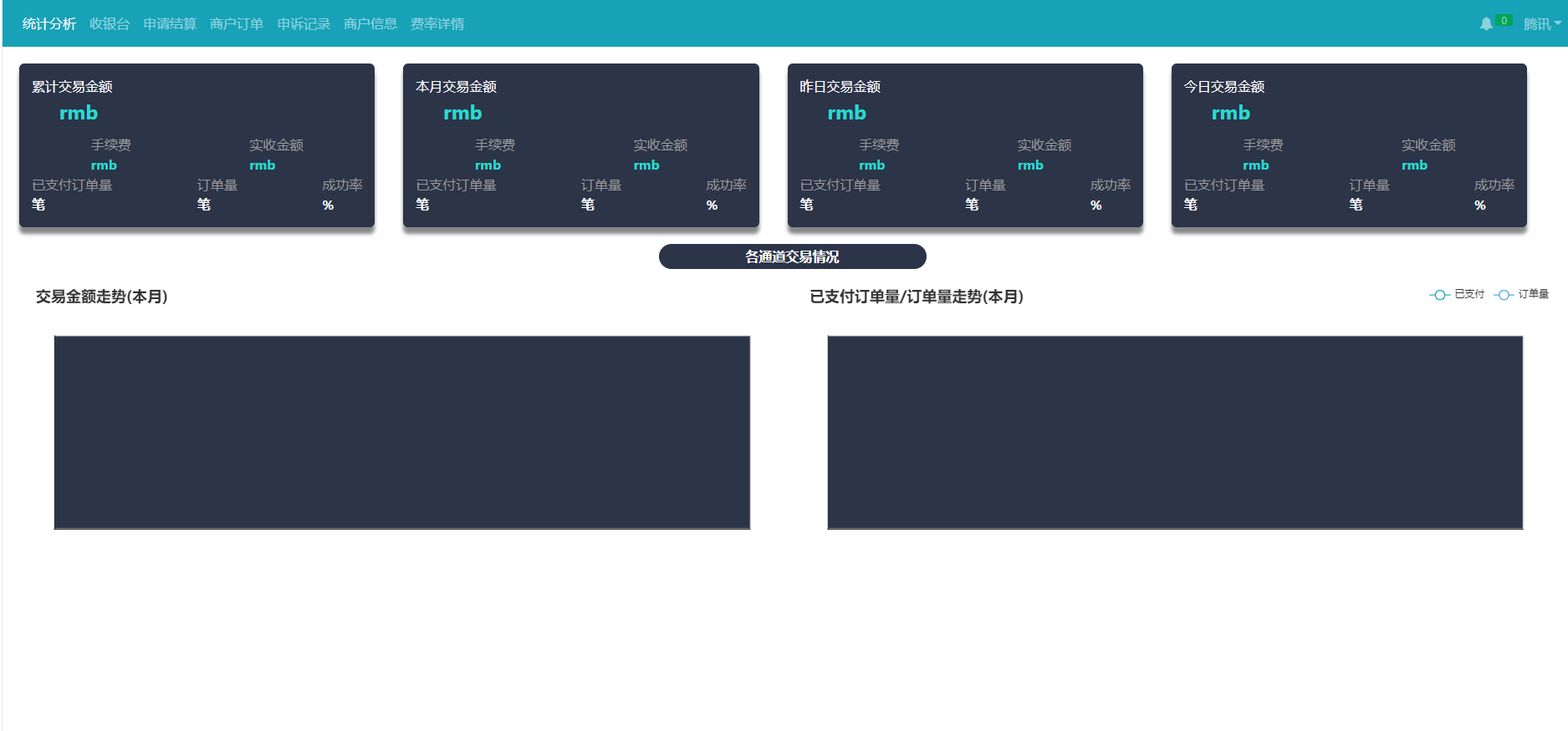 系统功能:统计分析、会员管理、日志管理、订单管理、收银台、代理业绩,