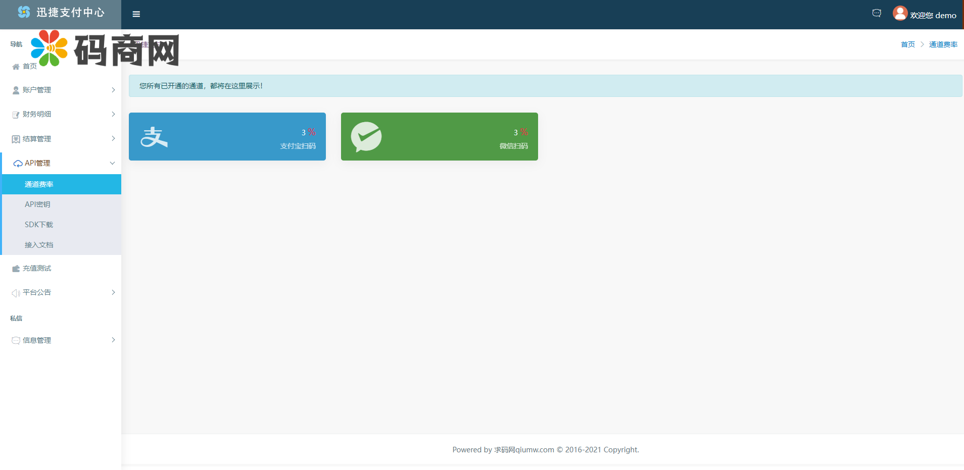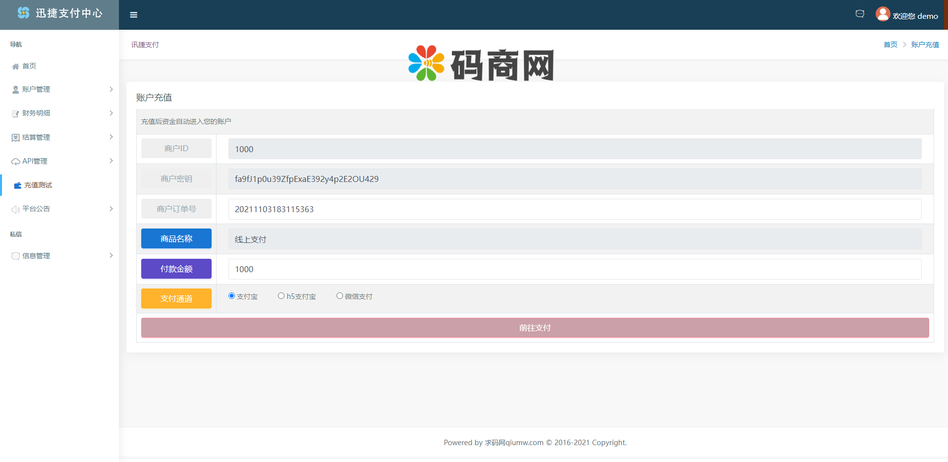 系统后台对接付费通三方公司的接口,填写商户号和TOKEN,可以自动生成付费通的聚合码,前端聚合码包成了H5,可以做支付宝和微信H5通道