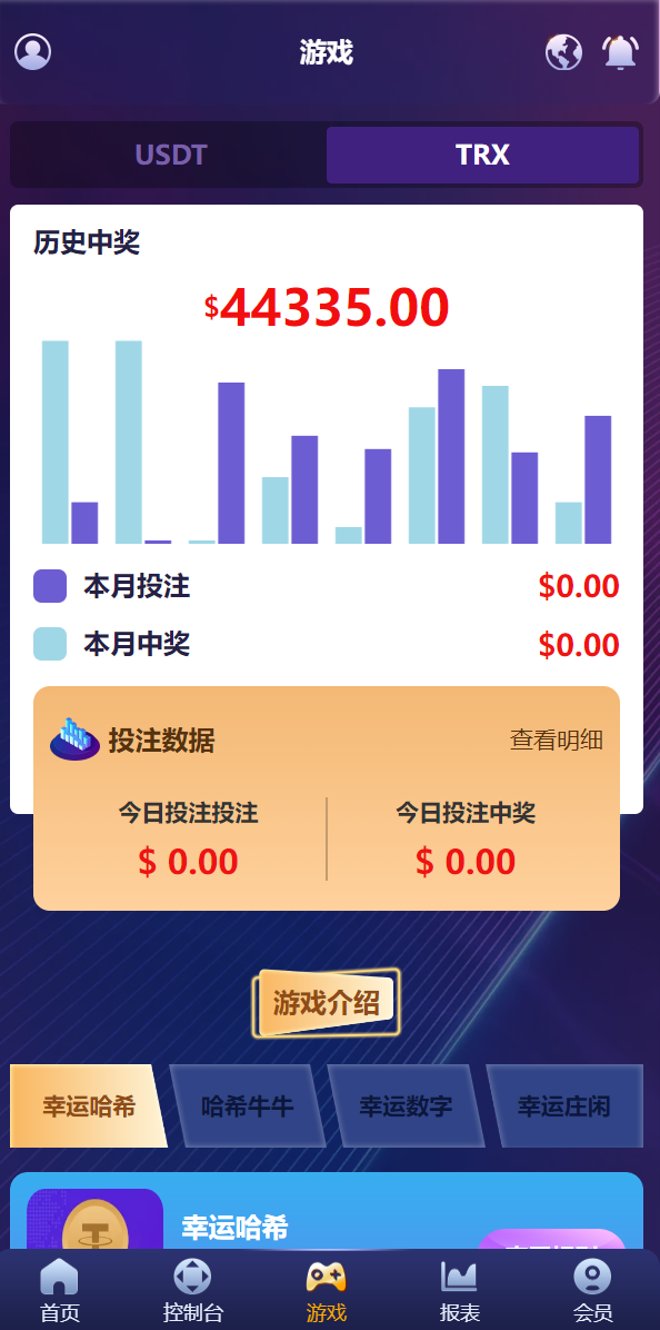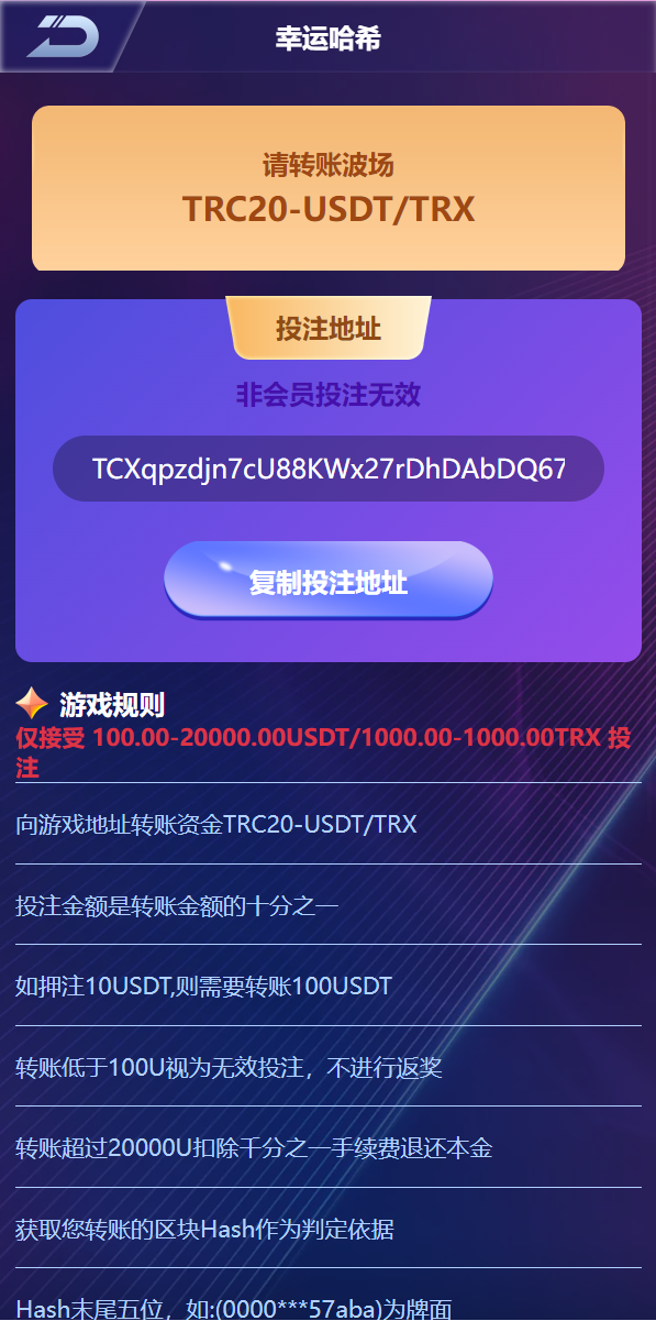 游戏有:幸运哈希、哈希牛牛、幸运数字、幸运庄闲、哈希PC10、哈希PK10