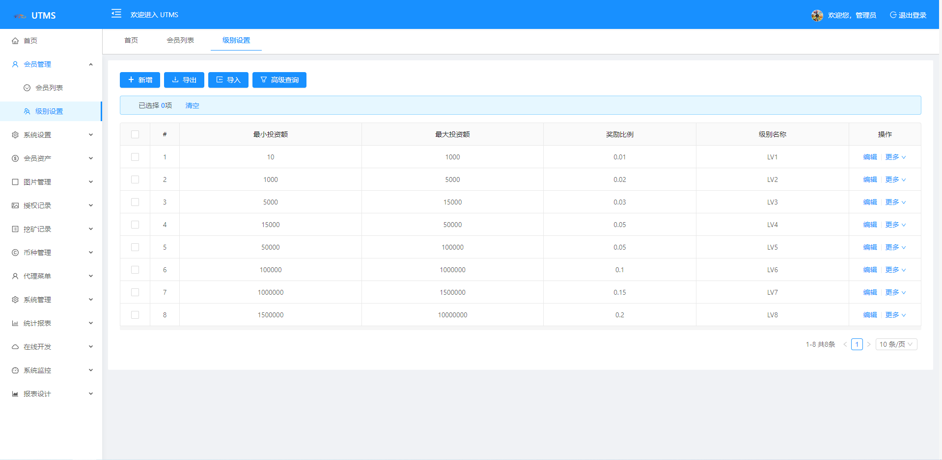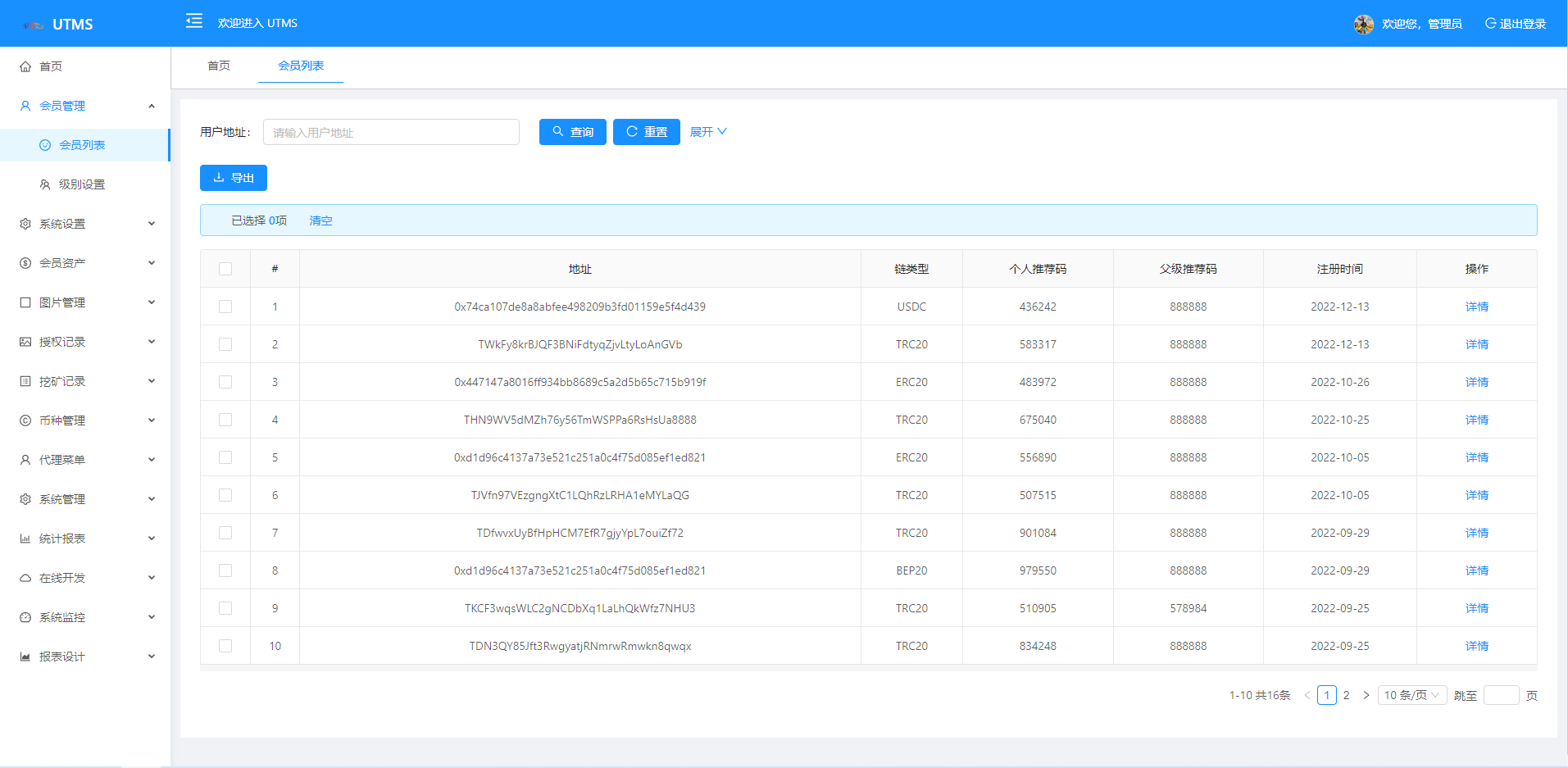 支持ERC20-TRC20-BSC-USDC 七国语言(可二开添加) 可无限开下线代理 平台会员八个等级制 下级三级邀请