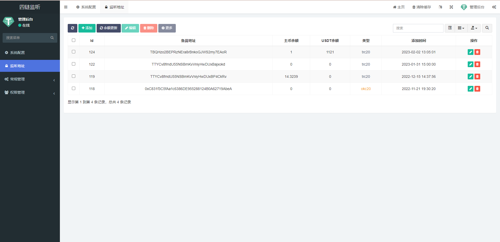 这是别人定制的TRC/ERC/BSC/OKC四链钱包余额交易监听系统,对接了telegram接收提醒